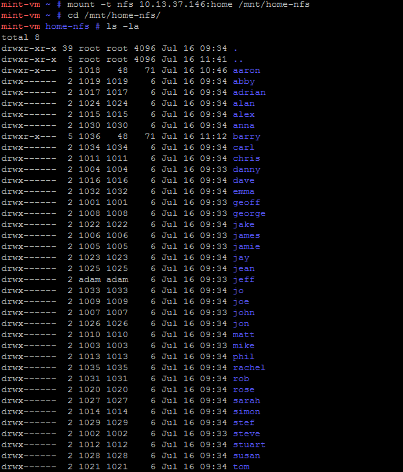 mkdir /mnt/home-nfs/ mount -t nfs 10.13.37.146:home /mnt/home-nfs