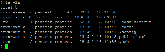 The presence of the “.bash_history” and “.ssh” folders suggest that this is a user’s home directory, and the “public_html” folder suggests that the Apache “UserDir” plugin is in use.